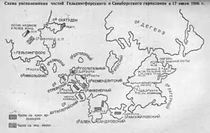 В Гельсингфорсе же действовала «финская красная гвардия». Утром 18 (31) июля 1906 в Гельсингфорсе командир красной гвардии Йохан Кок объявил всеобщую забастовку в поддержку восстания. В это время организованная под руководством полиции дружина под названием «Белая Гвардия» старалась помешать забастовке. В городе начался бой между красной гвардией, полицией и Охранным корпусом[4]. В районе Хаканиеми Красная гвардия и Охранный корпус в столкновениях друг с другом потеряли убитыми десятки человек.[5] Также красногвардейцы силой остановили железнодорожное сообщение Гельсингфорса с Або и с Выборгом. Полотно железной дороги между станциями Риихимяки и Рютюля (фин. ) было испорчено и в разных местах взорвано 4 железнодорожных моста.