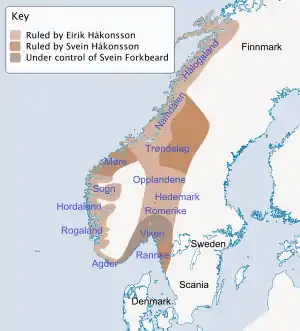 ![]() Раздел Норвегии после битвы у Свольдера. Территория, управляемая Эриком Хаконссоном Территория, управляемая Свейном Хаконссоном Территория под непосредственным управлением Свена Вилобородого. | |