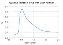 По мере приближения скорости к скорости звука появляется дополнительное явление волнового сопротивления. Это мощная форма сопротивления, которая начинается на околозвуковых скоростях (около 0,88 Маха). Около 1 Маха пиковый коэффициент сопротивления в четыре раза превышает дозвуковое сопротивление. Выше околозвукового диапазона коэффициент снова резко падает, хотя остается на 20% выше на 2,5 Маха, чем на дозвуковых скоростях. Сверхзвуковой самолет должен обладать значительно большей мощностью, чем требуется дозвуковому самолету для преодоления этого волнового сопротивления, и хотя крейсерские характеристики выше околозвуковой скорости более эффективны, они все же менее эффективны, чем полеты на дозвуковой скорости.