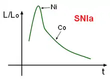 Сверхновые типа Ia имеют характерную кривую блеска, максимум светимости достигается спустя некоторое время после взрыва. Вблизи максимальной светимости спектр содержит линии элементов от кислорода до кальция; это главные составляющие внешних слоев звезды. Спустя месяцы после взрыва, когда внешние слои расширились до точки прозрачности, в спектре преобладает свет, излучаемый материалом около ядра звезды — тяжелыми элементы, синтезированными во время взрыва; наиболее заметны изотопы, близкие к массе железа (элементы подгруппы железа). В результате радиоактивного распада никеля-56 через кобальт-56 в железо-56 образуются высокоэнергетические фотоны, которые преобладают в излучении остатка сверхновой[4].
