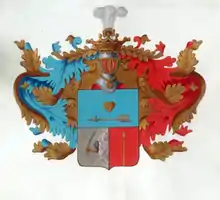 Щит увенчан обыкновенным дворянским шлемом с дворянской короной на нём и тремя страусовыми перьями. Намёт на щите голубого и красного цвета, подложенный золотом.