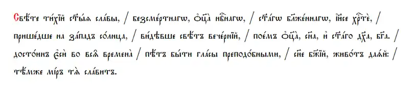 Све́те ти́хий Святы́я сла́вы, безсме́ртнаго Отца́ Небе́снаго, Свята́го Блаже́ннаго, Iису́се Христе́: прише́дше на за́пад со́лнца, ви́девше свет вече́рний, пое́м Отца́, Сы́на, и Свята́го Ду́ха, Бо́га. Досто́ин еси́ во вся времена́ пет бы́ти гла́сы преподо́бными, Сы́не Бо́жий, живо́т дая́й: те́мже мир тя сла́вит.[1]