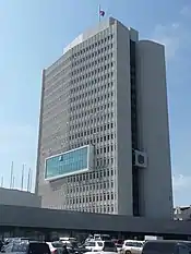 18-этажный «Белый дом» (раньше — дом Советов) является самым высоким общественным зданием города. В основу здания высотой 75,2 м был заложен стальной каркас с железобетонным ядром жёсткости блока лифтовых шахт. Облицовка — навесные керамзитобетонные панели. Здание введено в эксплуатацию в 1983 году. |