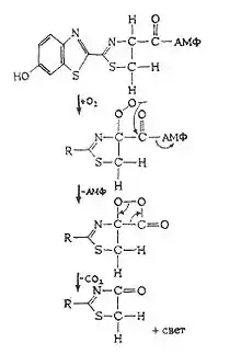 Свет образуется при окислении люциферина. Без люциферазы скорость реакции между люциферином и кислородом крайне низкая, катализация люциферазой значительно повышает её скорость. В качестве кофактора требуется АТФ.[31]