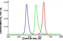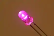 | Пурпурный | Смесь нескольких спектральных диапазонов | 2,48 < ΔU < 3,7 | Синий светодиод с красным люминофором Двойной: синий и красный диоды в одном корпусе Белый светодиод с пурпурным светофильтром | |