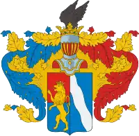 Описание герба: Выдержка из Общего гербовника Щит разделен перпендикулярно на две части, из коих в правой изображен стоящий лев в короне с загнутым хвостом, имеющий верхнюю половину золотую в красном поле, а нижнюю натурального цвета в серебряном поле. В левой части в серебряном же поле означена река с правого верхнего угла к левому нижнему текущая. Щит увенчан дворянским шлемом и короной, на поверхности которой два орлиных крыла. Намет на щите голубой и красный, подложенный золотом. |