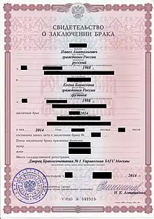 Свидетельство о заключении брака – это единственный имеющий юридическую силу документ о регистрации брака. Выдаётся в удостоверение факта государственной регистрации акта гражданского состояния, подписывается руководителем органа ЗАГС и скрепляется его печатью[5]. Форма свидетельства о браке утверждена приказом Министерства Юстиции РФ от 25 июня 2014 года №142[6].