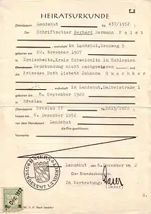 Свидетельство о заключении брака (§ 57 Закона о гражданском состоянии 1937 г.) в Германии является одним из видов записи актов гражданского состояния, получило правовой статус с 1 января 2009 года. Свидетельство о заключении брака изготавливается регистратором (клерком в ЗАГСе), заносится в реестр о браке и заверяется нотариально (подпись, печать). В некоторых частях свидетельства о браке может содержаться указание на прежнюю фамилию.