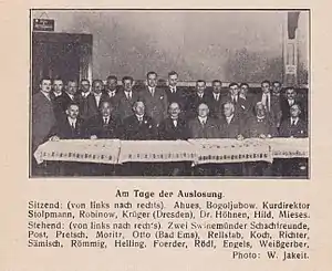 Сидят (слева направо): Ауэс, Боголюбов, директор курорта Штолпманн, Робинов, Крюгер, Хёнен, Хильд, Мизес. Стоят (слева направо): два местных игрока, Пост, Преч, Мориц, Отто, Рельштаб, Кох, Рихтер, Земиш, Рёммиг, Хеллинг, Фёрдерер, Рёдль, Энгельс, Вайссгербер
