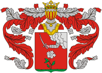 Описание герба: В щите, имеющем красное поле, изображена из облака выходящая рука в серебряные латы облачённая, держащая серебряную саблю вверх поднятую (польский герб Малая Погоня), внизу которой находится лилия серебром обозначенная. Щит увенчан обыкновенным шлемом с дворянской на нем короной. Намёт на щите красный, подложенный серебром |