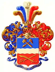 На щите дворянский коронованный шлем. Нашлемник: пять страусовых перьев, из коих среднее — серебряное, второе — лазуревое, четвёртое — червленое, крайние золотые. Намёт на щите справа лазуревый с золотом, слева червленый с золотом. Девиз: «Правдою и честью» золотыми буквами на лазуревой ленте.