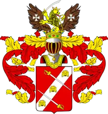 Щит увенчан дворянскими шлемом и короной. Нашлемник: выходящий до половины лев с саблей между двумя орлиными крыльями, с серебряными на них крестами. Намёт на щите красный, подложенный золотом.