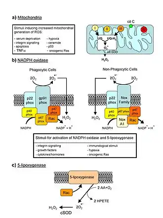Митохондрии являются основными продуцентами свободных радикалов в эукариотических клетках. Свободные радикалы, такие как: супероксид-радикал или гидроксид-радикал, в норме образуются в митохондриях в ходе работы дыхательной цепи, обеспечивающей синтез АТФ — основной энергетической «валюты» клетки[21].