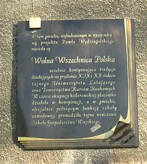 («В этом здании в 1929 году по проекту Павла Вендзягольского размещался Свободный польский университет, продолжавший традиции действовавших на рубеже XIX и XX веков Летающего университета и Общества научных курсов. Во время гитлеровской оккупации (университет) действовал в конспирации, а в здании, где официально действовало ПТУ, проводила тайное обучение Школа сельского хозяйства»).