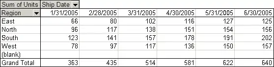 Сводная таблица обычно содержит строки, колонки и поля данных (или фактов). В этом случае, столбец — Ship Date, строка — Region. Нужные нам данные — это сумма единиц продукции (sum of Units). Эти поля допускают несколько видов функций агрегации, включая суммирование, нахождение среднего, стандартное отклонение, количество элементов и другие. В нашем случае, суммарное количество поставленных единиц продукции отражено в виде операции суммирования.