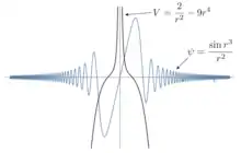 Для начала, возьмем функцию , тогда . Это расходящиеся сферические волны, поскольку энергия больше, чем потенциал , классическая кинетическая энергия остается положительной. Волновая функция принадлежит непрерывному спектру, интеграл расходится. Попробуем поменять волновую функцию таким образом, чтобы квадратичный интеграл сошелся, а потенциал варьировался вблизи −1.