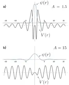 | 1) В работе фон Неймана и Вигнера[4] рассматривается два типа сферически-симметричных потенциалов, при этом в потенциале локализация происходит за счет «отражения» от бесконечности (т.к. на бесконечность материальная точка уходит за конечное время, скатываясь с этого потенциала, и вероятность нахождения там стремится к нулю). Аналогичный пример в 1D рассматривает экспоненциальную зависимость потенциала[5]. Второй тип потенциала[6][7] имеет сложную форму, но при этом периодически модулируется с периодом . Волновая функция с периодом отражается от такого потенциала в центр по аналогии с отражением от брэгговского зеркала. В одномерном случае такие потенциалы могут быть реализованы с помощью сверхрешеток[8][9].