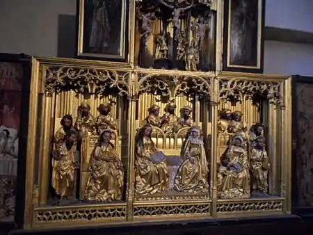 Три мужа св. Анны изображены на центральной панели позади неё (на балконе), причем в образе одного написан император Максимилиан. Остальные персонажи, вероятно, также изображают донаторов, написанных в образе евангельских героев.