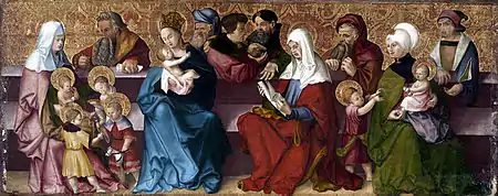 Одна из самых человечных, тёплых и многолюдных композиций, где сакральная сущность отходит на второй план по сравнению с впечатлением семейного портрета или даже фотографии.