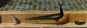 В первую очередь обращают на себя внимание изображённые на первом плане птицы. Они нарисованы весьма натуралистично, однако их статичные позы заставляют видеть в них чистые символы. Павлин обычно ассоциируется с гордостью и тщеславием, однако в христианской традиции его образ имеет и иное значение. Мясо павлина считалось столь жёстким, что не подлежало порче и гниению, а, стало быть, павлин ассоциировался с бессмертием и считался обитателем рая[17]. По этой причине изображение павлина часто встречается в римских катакомбах, на надгробиях и саркофагах[18]. Стоящий перед ним таз с водой также, несомненно, имеет символическое значение. Он должен был вызывать ассоциации с крестильной купелью, очищением и искуплением грехов[18]. Что касается куропатки, то с ней, вероятно, связана ещё более сложная символика. С одной стороны, существовало поверье, упоминающееся в том числе у Иеремии (Иер. 17:11), что куропатки крадут яйца других птиц, поэтому в христианском искусстве куропатка могла символизировать дьявола, похищающего души. С другой стороны, считалось, что птенцы куропатки обладают способностью самостоятельно отыскивать свою мать, подобно тому как души, верные Христу, в конце концов обретают его[18]. Джолли указывает также, что куропатка ассоциировалась с безудержной похотью: самка этих птиц могла якобы забеременеть от одного запаха самца[19]. Не исключено, что одновременно с традиционными негативными коннотациями Антонелло проводит и положительную параллель с непорочным зачатием Девы Марии[16].