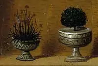 Мотив «Христовой невесты» подкрепляется, вероятно, и изображёнными на картине растениями. Одно из них идентифицируется как гвоздика, в XV веке символизировавшая помолвку и часто изображавшаяся на портретах обручённых пар[24]. Небольшое деревце в горшке (возможно, самшит[21]) может обозначать hortus conclusus, «запертый сад», являющийся символическим обозначением Девы Марии. Наконец, предметы, непосредственно окружающие святого, — шкатулки-дарохранительницы и стоящий на полке прозрачный графин — также заимствованы из мариологической иконографии, где ассоциируются, соответственно, с её чревом, приявшим Христа, и её чистотой[13].