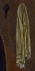 В подобное прочтение вписываются и остальные предметы, изображённые на картине. Среди них особенно заметно висящее на стене слева полотенце. Оно могло бы символизировать чистоту Девы — но на нём слишком хорошо заметны нарисованные художником пятна[18]. Поэтому, как и всё, что расположено слева, полотенце символизирует, скорее, утрату чистоты. Рядом с ним на стене висит небольшая лампа, но в этой лампе не горит огонь. Очевидно, это должно напомнить зрителю притчу о мудрых и неразумных девах, которую цитирует в своём письме Иероним. Он подразумевает, что просто хранить девственность недостаточно, нужно и в помыслах всячески бороться с соблазном, чтобы остаться достойной небесного Жениха[20].