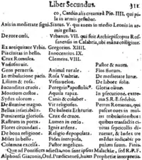 Впервые текст пророчества был опубликован в 1595 году бенедиктинцем Арнольдом де Вионом (Arnold de Wyon) в его книге «Lignum Vitae» («Древо жизни»)[9].