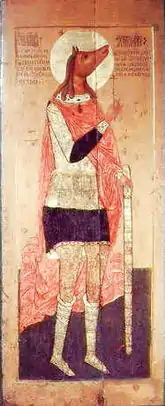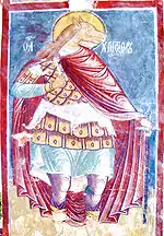 - прекрасный юноша, с длинными волосами, с четырёхконечным крестом в правой руке; на нём багряный плащ, туника украшена золотыми полосами (примеры изображений — фрески в монастыре Высокие Дечаны, церкви Святого Георгия в Старой Ладоге, мозаика кафоликона монастыря Осиос Лукас и др).