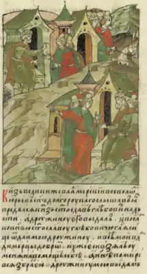 ![]() Всеволод III Большое Гнездо посылает к Святославу Глебовичу с требованием вернуть дружину Всеволода | |