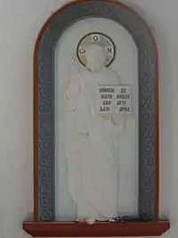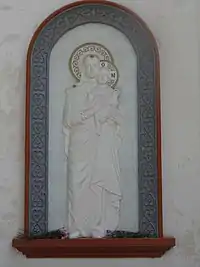 | Барельеф, Дева Мария с младенцем на стене собора. | Свято-Никольский собор | Барельеф Иисуса Христа на стене собора. |