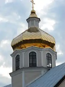 Колокольня высотой около 25 м примыкает к плоскости западного фасада. Две нижние части трехъярусной колокольни — четырехугольные, верхняя часть — восьмиугольная с луковичным куполом, который завершает восьмиконечный крест. Ближе к восточной стене здания возвышается купол, украшенный «светильником» и восьмиконечным крестом над ним. Барабаны обоих куполов украшены кокошниками.