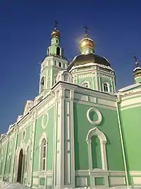 Здание собора представляет собой типичную для Русско-византийского стиля архитектуры трёхглавую церковь с высокой колокольней при входе, массивным куполом посередине и небольшой главкой-маковкой над алтарём. Основной купол храма стоит на восьмигранном основании, которое возвышается над прямоугольным корпусом, на куполе располагается главка. Главка над алтарём стоит на примыкающей к основному массиву апсиде. С запада над притвором возвышается четырёхъярусная колокольня. Интерьер храма довольно разнообразен: углы образуют двойные пилястры, проёмы окон прорезаны круглой и арочной формы, на фасаде здания имеются использования декоративных кокошников и наличников с килевидным завершением и лжеокна круглой формы. Ранее храм был бежевого цвета, но последние 15 лет он окрашен в зелёный с белыми полосами на карнизах, выступах и декоративных элементах. Купола золотые с золотыми маковками и золотыми крестами; кровли на крыше и карнизах и навес над входом тёмно-зелёные.