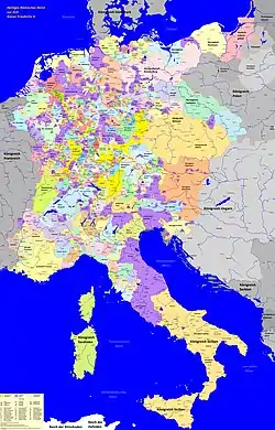 В 1220 году германским императором был коронован Фридрих II Гогенштауфен, сын Генриха VI и король Сицилии, который возобновил политику Гогенштауфенов по установлению имперского господства в Италии. Он пошёл на жёсткий конфликт с папой римским Гонорием Третьим, был отлучён от церкви и объявлен антихристом, но тем не менее предпринял крестовый поход в Палестину и был избран королём Иерусалима. В правление Фридриха II в Италии развернулась борьба гвельфов, сторонников папы римского, и гибеллинов, поддерживавших императора, развивавшаяся с переменным успехом, но в целом достаточно удачно для Фридриха II: его войска контролировали большую часть Северной Италии, Тоскану и Романью, не говоря о наследственных владениях императора в Южной Италии. Сосредоточенность на итальянской политике, однако, вынудила Фридриха II пойти на существенные уступки немецким князьям. Соглашением с князьями церкви 1220 года и Постановлением в пользу князей 1232 года за епископами и светскими князьями Германии были признаны суверенные права в рамках территории их владений. Эти документы стали правовой основой для формирования в составе империи полунезависимых наследственных княжеств и расширения влияния региональных правителей в ущерб прерогативам императора[37].