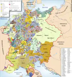 Поддержание престижа и сохранение возможности проведения независимой политики в условиях укрепления региональных княжеств и усиления соседних держав императорам XIV века позволяла опора на собственные наследственные владения: Австрийское герцогство и верхнешвабские земли при императорах из дома Габсбургов, Баварию и Пфальц при Людвиге IV и владения Чешской короны при Люксембургах. В этом отношении показательно царствование короля Богемии Карла IV (1346—1378), в период правления которого центр империи переместился в Прагу. Карлу IV удалось провести важную реформу конституционного устройства империи: Золотой буллой императора 1356 года была учреждена коллегия курфюрстов из 7 членов, в состав которой вошли архиепископы Кёльна, Майнца, Трира, сам король Чехии, курфюрст Пфальца, герцог Саксонии и маркграф Бранденбурга. Члены коллегии курфюрстов получили исключительное право избрания императора и фактически определять направления политики империи, за курфюрстами было также признано право внутреннего суверенитета, что закрепило раздробленность немецких государств. В то же время было устранено всякое влияние папы на выборы императора[40][41].