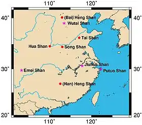 - Север: Хэншань (Шаньси), провинция Шаньси, 2017 м; знаменита висячим монастырём Сюанькун-сы