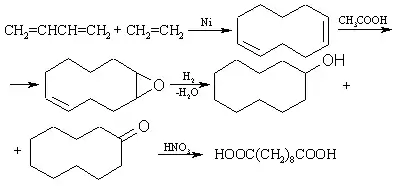 Себациновую кислоту можно также получить окислением циклодекана HNO3 или из 1,3-бутадиена и этилена по схеме: