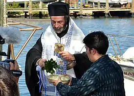 ![]() Епископ Севастиан окунает несколько оливковых ветвей в святую воду на Богоявление. 5 января 2014 года | ||