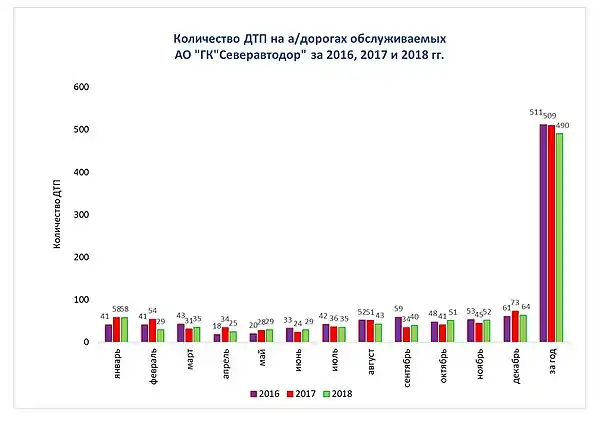- Количество ДТП на дорогах, обслуживаемых АО ГК «Северавтодор» (2016—2018 гг.)