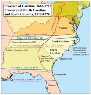 Согласно хартии Карла II, изданной в 1663 году, в территорию колонии Каролины входили все земли от южной границы колонии Виргиния, проходившей по 36 градусу северной широты, до 31-го градуса северной широты (вдоль побережья современной Джорджии). Из-за существенных различий между северной и южной частями колонии, а также из-за трудностей сообщениям между ними, в 1691 году был назначен специальный вице-губернатор для управления северной частью колонии. Разделение колонии на северную и южную части завершилось в 1712 году, когда первым губернатором Северной Каролины стал Эдвард Хайд. В 1729 году королевская администрация выкупила права на колонию у лордов-собственников и образовала на территориях Северной Каролины королевскую колонию. Оставшаяся одна восьмая часть провинции (часть Северной Каролины, известная как округ Гренвиль), до 1776 года оставалась в собственности рода Картерет, пока в результате войны за независимость США не была конфискована революционным правительством Северной Каролины.