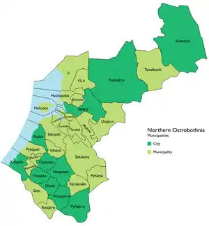Северная Похьянмаа состоит из 34 общин (муниципалитетов) (с 1.1.2010, после объединения Калайоки и Химанка[2]), из которых 11 — города, а 23 — сельские общины.