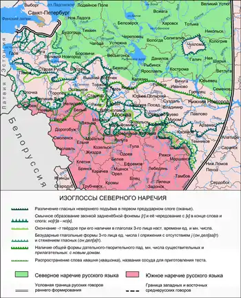 К основным диалектным чертам севернорусского наречия в области фонетики, отличающим его от южнорусского наречия, относят[30]: