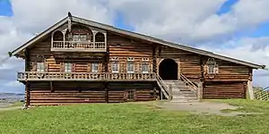 Особенности в постройке традиционного сельского жилища обусловлены суровым климатом, характерным для Русского Севера — продолжительными и снежными зимами. Кроме того, важным условием, повлиявшим на формировании севернорусского типа жилища, было обилие леса. Повсеместно распространёнными были большие рубленые постройки, соединявшие, как правило, жилые и хозяйственные помещения под общей крышей. В отличие от южнорусского жилища, в котором преобладала четырёхскатная крыша, на севере чаще всего строили двускатные крыши, четырёхскатные («костром») встречались преимущественно в городах Русского Севера. Крыши покрывались в основном деревом (тёсом, драннкой, реже — соломой). Севернорусское жилище, особенно в XIX — начале XX века, украшалось обилием прорезной и плоской геометрической (с невысоким рельефом) резьбы[39].