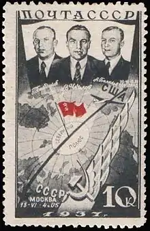 Валерий Чкалов совершил первый удачный межконтинентальный перелёт через Северный полюс на самолёте. 18 июня 1937 года он вылетел из Москвы на самолёте АНТ-25 в команде со вторым пилотом Георгием Байдуковым и штурманом Александром Беляковым. 20 июня, через 63 часа 16 минут полёта, преодолев 8504 км, их самолёт приземлился в г. Ванкувер (США)[55]. Месяц спустя (12—14 июля 1937 года) экипаж в составе командира Михаила Громова, второго пилота Андрея Юмашева и штурмана Сергея Данилина перелетел на АНТ-25 из Москвы через Северный полюс до г. Сан-Джасинто (Калифорния), преодолев за 62 часа 17 минут 10 148 км[56].