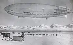 Первой доказанной удачной попыткой полёта над Северным полюсом стала в 1926 году экспедиция Руаля Амундсена на дирижабле «Норвегия»[51]. В экспедиции было 16 участников, включая создателя и пилота дирижабля итальянца Умберто Нобиле, американского полярного исследователя и спонсора экспедиции Линкольна Эллсворта, полярного исследователя Оскара Вистинга, ставшего рулевым дирижабля, штурмана Яльмара Рисер-Ларсена, метеоролога Финна Мальмгрена и других исследователей, а также собака Нобиле по кличке Титина (Titina), ставшая талисманом экспедиции. Полёт начался на Шпицбергене, 12 мая 1926 года дирижабль достиг Северного полюса, откуда проследовал до Аляски[49].