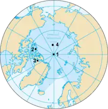 Ближайшим участком суши к Северному полюсу считается либо остров Каффеклуббен, либо остров ATOW1996; а ближайшим населённым пунктом — поселение Алерт на острове Элсмир (территория Нунавут, Канада) в 817 километрах от Северного полюса.