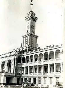 Первый ярус центральной башни окружён аркадами, второй — колоннами и украшен эмблемами мореходства, а завершают композицию башенные часы с четырёхсторонним циферблатом и высокий шпиль с золотой пятиконечной звездой[10]. Механизм башенных часов содержит уникальные куранты, перевезённые в Москву из Воскресенского собора г. Волоколамска[11]. Звезда, венчающая шпиль, сходна с первыми звёздами, украшавшими Спасскую башню Кремля до установки на неё рубиновой звезды, но, вопреки расхожим мнениям, на самом деле никогда на ней не установленная[12], серп и молот на золотой звезде были инкрустированы уральскими самоцветами (впоследствии утраченными)[13]. У подножия башни размещалось четыре скульптуры работы Ромуальда Иодко: Южанка, Красноармеец, Северянин и Краснофлотец[14].
