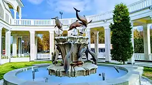 Проект вокзала учитывает естественный уклон земли в сторону набережной, архитекторы использовали его для создания перехода здания от двух этажей со стороны парка к трём этажам со стороны причалов. Боковые крылья здания опоясаны двухъярусными галереями, который завершаются ротондами с фонтанами посередине. Выполненные из белого мрамора, фонтаны называются «Полярный» (или «Северный», скульптор Лев Кардашов) и «Фонтан Юга» (или «Черноморский фонтан», скульптор Иван Ефимов[15]). Тема «Полярного фонтана» — птичий базар, для него были изготовлены из красной меди фигуры гагар и диких гусей с раскинутыми крыльями[16], в центре пьедестала чашу фонтана поддерживает группа белых медведей[9]. Южный фонтан изображал группу играющих на волне дельфинов, расположенных на стеклянных шарах[17][13].