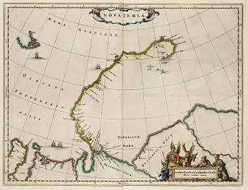 В XI—XII веках остров открыли новгородские купцы. Из западных европейцев первым район посетил Хью Уиллоби в 1553 году в ходе неудачной экспедиции в поисках северного морского пути на восток. Голландец Виллем Баренц в 1596 году обогнул северную оконечность острова и осуществил зимовку на восточном побережье в районе мыса Спорый Наволок, после этого он погиб где-то на северо-восточном побережье острова в попытке вернуться. Голландские экспедиции дали названия многим топонимам острова, многие из них были изменены в XIX и XX веках, но голландское влияние прослеживается до сих пор. Первым русским исследователем Новой Земли считается штурман Фёдор Розмыслов (1768—1769).