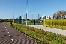 Рекреационная часть парка расположена вдоль улиц Академика Флерова и Фёдора Дубовицкого — входные группы располагаются на обеих улицах. В 2017—2018 годах здесь прошло благоустройство[27]. В зелёной зоне обустроили детскую площадку и спортивные зоны — футбольное поле, баскетбольная площадка и воркауты. Вдоль территории проложены пешеходные тропы с деревянным настилом и велосипедные дорожки, а в её центре располагается заболоченный Пахомовский пруд.