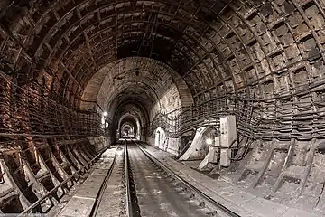Максимальная глубина тоннеля от поверхности около 1 км, диаметр тоннеля без отделки 9,5 м. В виду сложности гидрогеологических условий, была также сооружена опережающая разведочно-транспортная дренирующая штольня меньшего диаметра и сообщающаяся с основным тоннелем сбойками через каждые 150-200 м. В дальнейшем она эксплуатируется для отвода воды, вентиляции, служебных нужд по обслуживанию тоннеля[7], для доставки оборудования и персонала по обслуживанию тоннеля в ней проложена узкоколейная железная дорога[8].